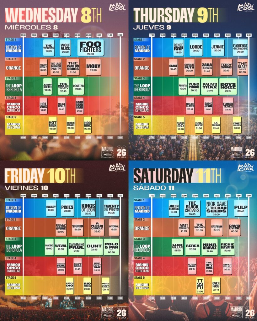 Mad Cool Festival publica los horarios oficiales de su edición 2026, que se celebrará del 8 al 11 de julio en Madrid con más de 70 artistas internacionales