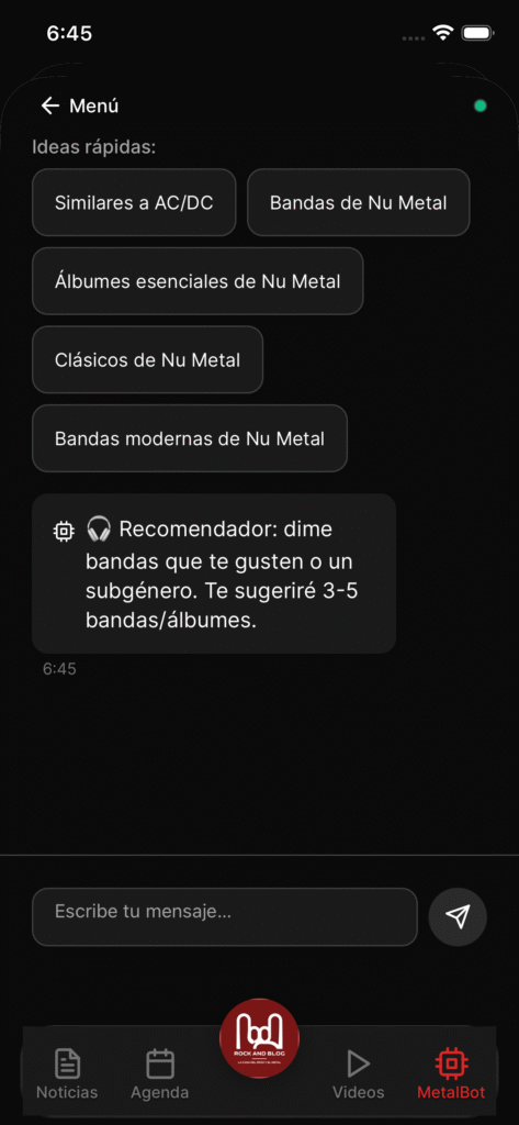 Nuestro chatbot con inteligencia artificial está listo para responder a tus dudas, recomendarte nuevas bandas y contarte todo sobre la historia del rock y el metal.