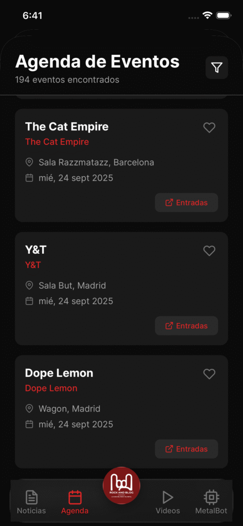• Agenda de conciertos: No te pierdas ningún show. Mantente al día con las giras y fechas de tus bandas favoritas