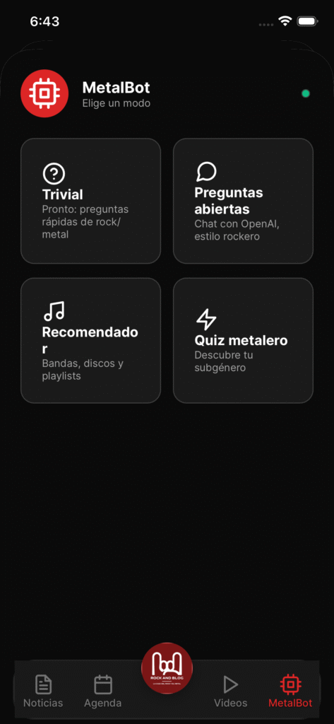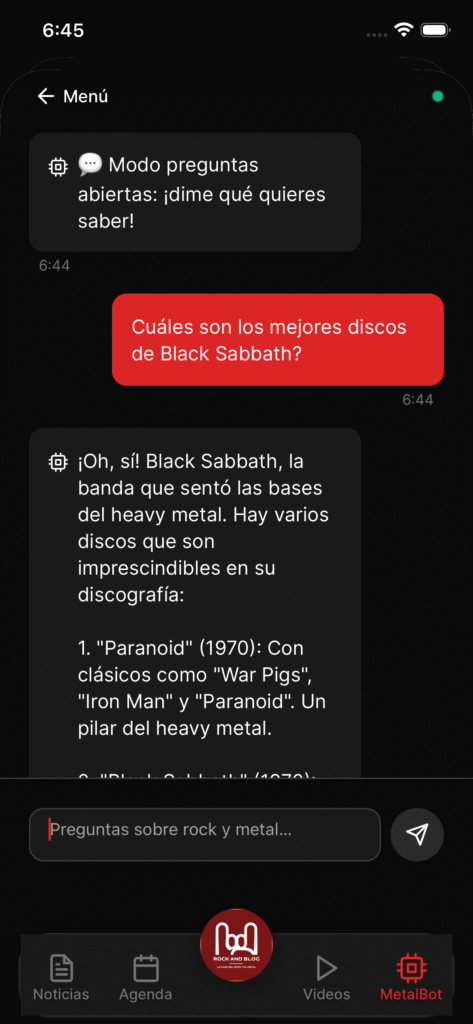 • MetalBot: Nuestro asistente de IA especializado en rock y metal, listo para responder tus preguntas y recomendarte música