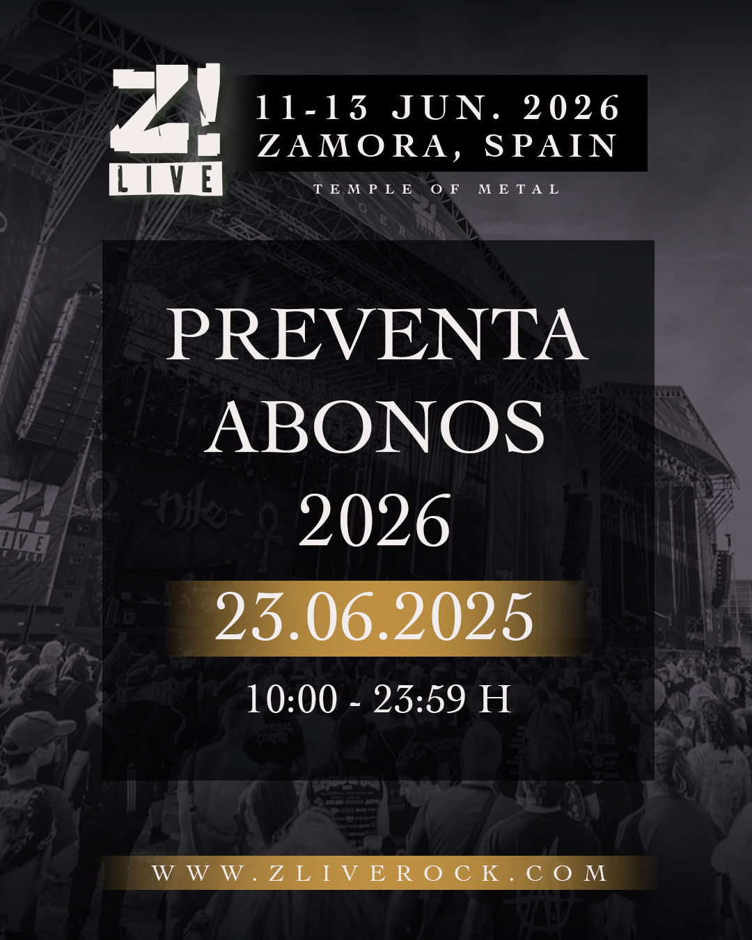 Todavía con las emociones a flor de piel y en plena elaboración de la crónica de lo vivido en la épica edición de 2025, el Z! Live no da tregua y ya apunta al futuro. El festival zamorano ha anunciado oficialmente las fechas de su undécima edición, que tendrá lugar del jueves 11 al sábado 13 de junio de 2026. Una vez más, Zamora se convertirá durante tres días en el epicentro del metal nacional e internacional.